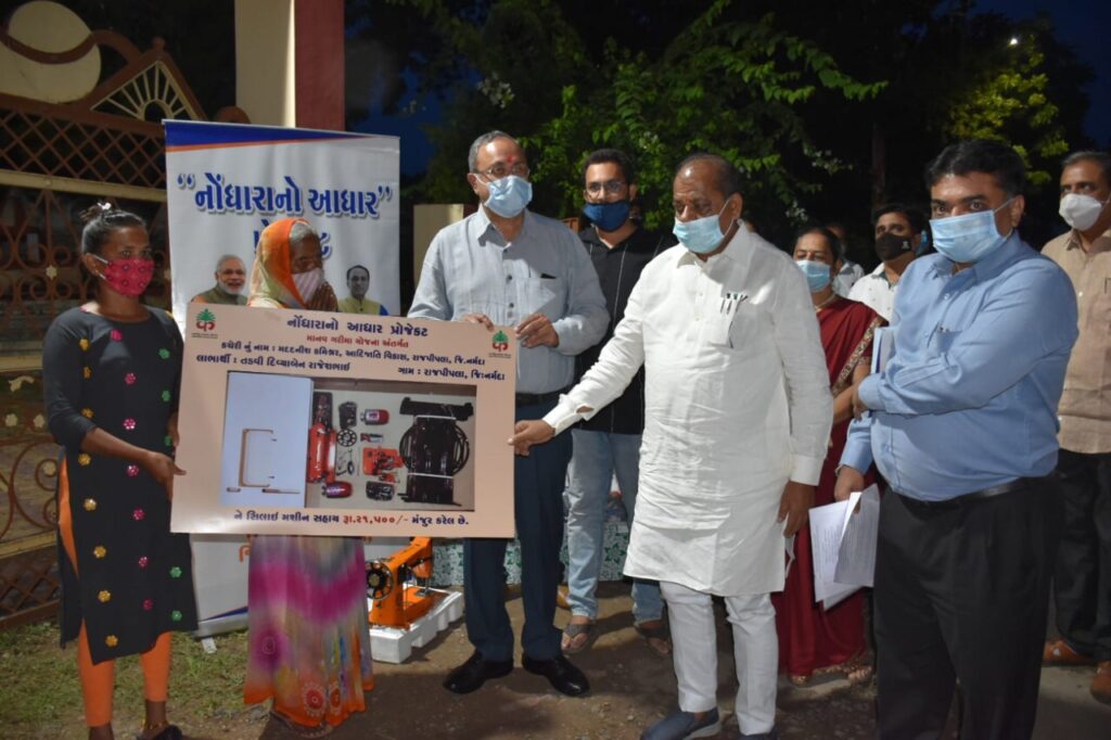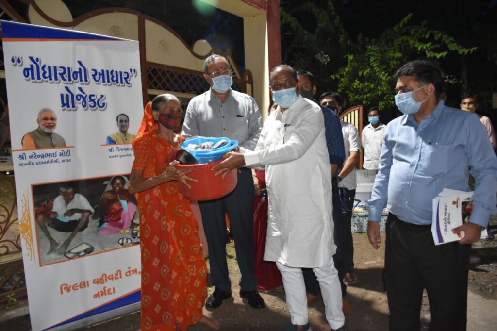તદ્અનુસાર ગુજરાતના ઉર્જા મંત્રી સૌરભભાઇ પટેલ અને રાજ્યકક્ષાના ગ્રામ વિકાસ તથા નર્મદા જિલ્લાના પ્રભારી મંત્રી બચુભાઇ ખાબડે તેમની નર્મદા જિલ્લાની મુલાકાત દરમિયાન દક્ષિણ ગુજરાત વિજ કંપની લી. ના નવનિર્મિત ભવનના લોકાર્પણ બાદ આ બંને મંત્રીઓના હસ્તે રાજપીપલામાં રાજવંત પેલેસની સામે શીતળા માતાના મંદિર પાસે આ “નોંધારાનો આધાર” પ્રોજેક્ટ અંતર્ગત બે લાભાર્થી મહિલાઓને ભોજન પીરસવાની સાથે જીવન જરૂરિયાતની કુલ-૪૩ જેટલી ચીજવસ્તુઓ ધરાવતી કિટ્સનું વિતરણ કરાયું હતું. તદ્ઉપરાંત સ્વરોજગારી માટે માનવ ગરિમા યોજના હેઠળ વજન કાંટા સહિતની હાથલારી તેમજ એક લાભાર્થી મહિલાની દિકરીને પણ સ્વરોજગારી માટે સિલાઇ મશીનની કિટનું વિતરણ કરાયું હતું.