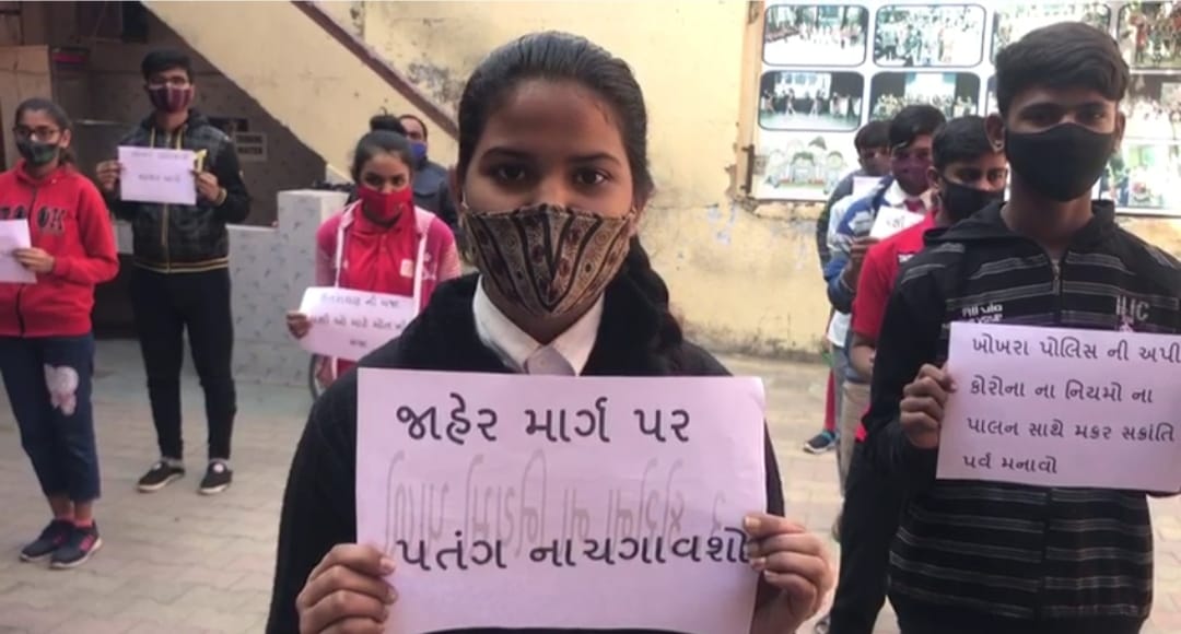 અમદાવાદ: ઉત્તરાયણ નિમિતે પતંગની દોરીથી પક્ષીઓને બચાવવા પતંગ નહીં ઉડાડવાનો સંકલ્પ અમદાવાદની શાળાના વિદ્યાર્થીઓ દ્વારા લેવામાં આવ્યો હતો.અમદાવાદના હાટકેશ્વર- ભાઈપુરા વોર્ડના ધી મધર ઈંગ્લીશ સ્કુલ, અર્ચના વિધાલય, ઉદગમ વિધાલયના ધોરણ 10 અને 12 ના વિધાઁથીઓ પક્ષીઓના બચાવ કાજે પતંગ ના ચગાવવા નો સંકલ્પ લીધો હતો.કોરોના ના નિયમો ના પાલન માટે તેમજ મકરસંક્રાંતિ પર્વમાં શહેર પોલિસ કમિશ્ર્નર ના જાહેરનામા ના અમલ માટે નગરજનો ને કરી અપીલ તેમજ સુચક બેનરો સાથે ઉતરાયણ પવઁ મા પક્ષી ઓના બચાવ અભિયાન મા જોડાયાઆ પસંગે ખોખરા પોલિસ ઈન્સપેકટર શ્રી કે એસ ચૌધરી સહિત પોલિસ જવાનો ઓ એ હાજર રહ્યી ને વિધાઁથીઓને માહિતગાર કરી ને શહેર પોલિસ ના જાહેરનામા ના અમલ સાથે પરિજનો અને આસપાસ ના મિત્રવતુઁળમા ઉતરાયણ પર્વ સાવચેતી સાથે નિયમો ના પાલન થકી ઉજવવા પોલિસ ઈન્સપેકટરશ્રીએ વિદ્યાર્થીઓને સંકલ્પબદ્ધ કરાવ્યા હતા