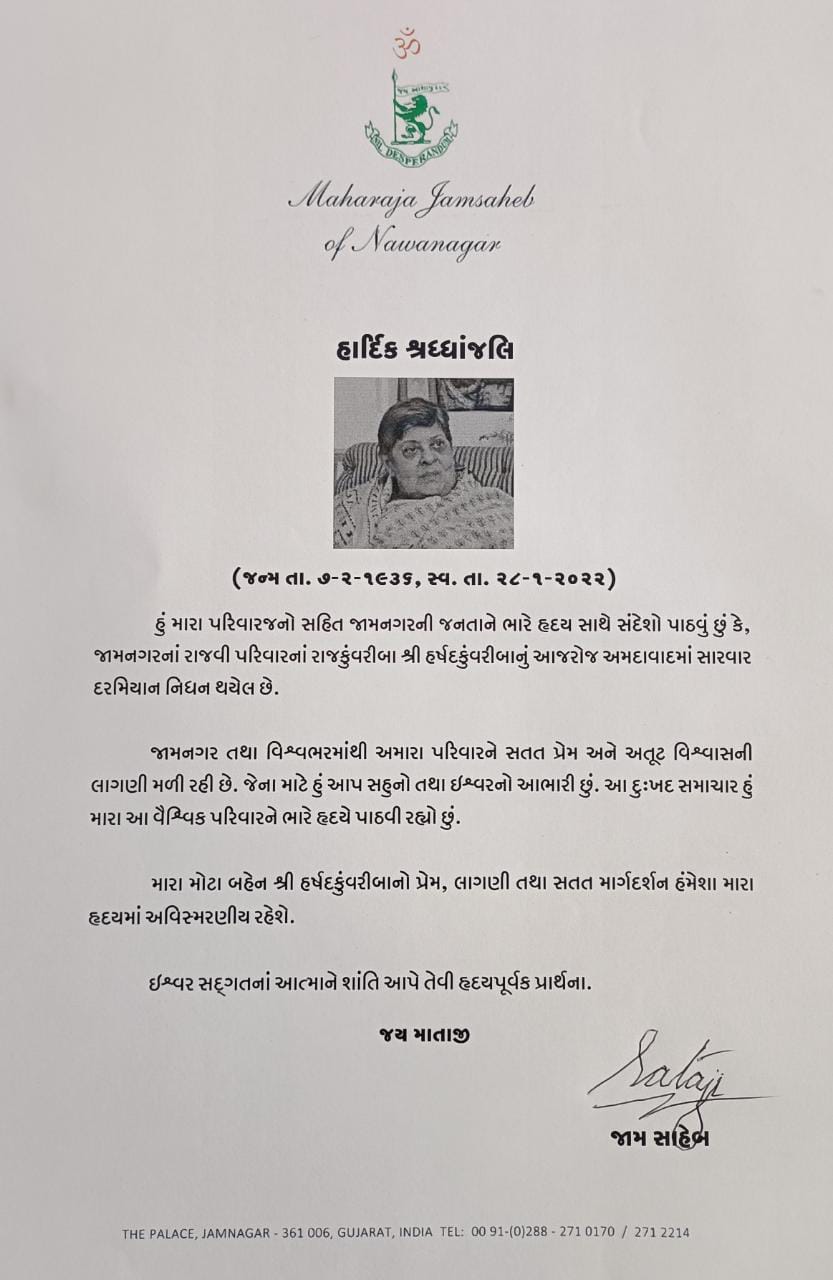 .જીએનએ જામનગર: અમદાવાદના એપોલો હોસ્પિટલ ખાતે સારવાર લઈ રહેલ જામનગર રાજવી પરિવારના રાજકુંવરીબા હર્ષદકુવરિકાબાનું 86 વર્ષની વયે અવસાન થવા પામ્યું છે.