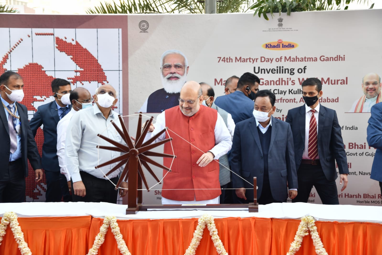 તો આપણો સંસ્કૃતિ સાથેનો નાતો પણ તૂટશે. ગૃહમંત્રીશ્રીએ આ અવસરે ઉપસ્થિત નાગરિકોને ખાદીનો ઉપયોગ કરીને દેશના ગરીબોને ગૌરવભેર જીવન જીવવાનો અવસર આપવા માટે પણ અપીલ કરી હતી. તેમણે વર્તમાન સમયમાં પણ ખાદી એટલી જ પ્રાસંગિક છે તેમ ઉમેર્યું હતું. કેન્દ્રીય ગૃહ અને સહકારમંત્રીશ્રીએ આ અવસરે માટીના કૌશલ્યકારોને ઈલેક્ટ્રીક ચાકડાનું અને મધ-ઉત્પાદન સાથે સંકળાયેલા ઉદ્યમીઓને મધમાખી ઉછેર માટેની પેટી ઓનું વિતરણ કર્યું હતું. -: *શ્રી ભૂપેન્દ્ર પટેલ* :-આ પ્રસંગે મુખ્યમંત્રી શ્રી ભૂપેન્દ્ર પટેલે સાબરમતિ રિવરફ્રન્ટની ગરિમા અને સુંદરતામાં વધારો કરતું નવું નજરાણું અમદાવાદને આપવા બદલ શ્રી અમિતભાઇ શાહનો આભાર વ્યક્ત કરતા જણાવ્યું કે, ભારત સરકારના ખાદી વિલેજ ઇન્ડસ્ટ્રી કમિશન દ્વારા તૈયાર કરવામાં આવેલું બાપુનું આ ભીંતચિત્ર ગાંધી નિર્વાણદિને પૂજ્ય બાપુને ભાવભરી શ્રદ્ધાંજલિ છે.અમદાવાદના રિવરફ્રન્ટ હાઉસમાં સ્થાપિત મહાત્મા ગાંધીજીનું આ ભીંતચિત્ર શહેરના નાગરિકો અને પ્રવાસીઓ માટે આકર્ષણનું નવું કેન્દ્ર બનશે તેવો વિશ્વાસ વ્યક્ત કરતા જણાવ્યું કે, આ ભીંતચિત્ર દેશભરના 75 હુન્નરમંદ કારીગરો બનાવેલા માટીના 2975 કુલ્ડની તૈયાર કરાયું છે. આઝાદ દેશના 75માં વર્ષે 100 સ્કેવર મિટરનું આ ભીંતચિત્ર પૂજ્ય બાપુએ પરફેક્ટ ટ્રીબ્યુટ છે. એટલું જ નહીં, સાબરમતિના સંત તરીકે જાણિતા ગાંધીજીના ભીંતચિત માટે સાબરમતિ રિવરફ્રન્ટથી વિશેષ કોઇ અન્ય જગ્યા ન હોઇ શકે.સાબરમતિ નદીના આજ તટેથી વડાપ્રધાનમંત્રી શ્રી નરેન્દ્રભાઇ મોદીએ આઝાદીનો અમૃત મહોત્સવનો પ્રારંભ કરાવ્યો છે. એટલું જ નહીં, દેશના પ્રથમ હેરિટજે શહેર અમદાવાદની સાબરમતી નદીના કિનારેથી મહાત્માં ગાંધીએ દેશને ખાદીની પ્રેરણા આપી હતી એમ તેમણે મુખ્યમંત્રીશ્રીએ ઉમેર્યું હતું. શ્રી ભૂપેન્દ્રભાઇ પટેલે કહ્યું કે, ગાંધીજી પરંપરાગત હસ્તકલાઓ તેના કસબીઓ અને ગૃહ ઉદ્યોગના હંમેશા હિમાયતી રહ્યા હતા. ગાંધીજીના આ સ્વપ્નને સાકર કરવા આજે દેશ પ્રધાનમંત્રી શ્રી નરેન્દ્રભાઇ અને અમિતશાહના માર્ગદર્શનમાં સ્વરાજ્યથી સુરાજ્યનો માર્ગ અને આત્મનિર્ભર ભારતની નેમ સાકર કરવાની દિશામાં આગળ વધી રહ્યો છે. આત્મનિર્ભર ભારતમાં દેશના હસ્તકલા કારીગરો, પરંપરાગત ગૃહઉદ્યોગ વ્યવસાયકારોના ઉત્પાદનોને વોકલ ફોર લોકલના મંત્રથી વિશ્વ સમક્ષ મૂકવામાં આવી રહ્યા છે એમ તેમણે સ્પષ્ટપણે મુખ્યમંત્રી શ્રી જણાવ્યું હતું. મુખ્યમંત્રી શ્રીએ પૂજ્ય બાપુને યાદ કરતા કહ્યું કે, મહાત્મા ગાંધી હંમેશા કહેતા કે, ખાદી એ વસ્ત્ર નથી પણ એક વિચાર છે અને ગાંધીજીએ અંગ્રેજો સામે લડવા માટે ચરખાને જ મુખ્ય હથિયાર બનાવ્યો હતો. એટલું જ નહીં, મહાત્મા ગાંધી ખેતી અને ખાદીને જોડીને તેને સ્વરાજનું સાધન બનાવવા માંગતા હતા અને 