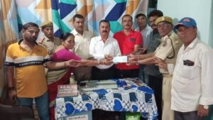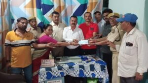 અમરેલી જિલ્લાના ખાંભા તાલુકા હોમગાર્ડઝ યુનિટના હોમગાર્ડ જવાનશ્રી કિશોર એમ. વિસાણીનાં પુત્રીના લગ્નપ્રસંગે કલ્યાણ નિધિ માથી સહાય ચેક અર્પણ કરાયો ડાયરેક્ટર જનરલ સાહેબ શ્રી ગુજરાત રાજ્ય હોમગાર્ડઝ અમદાવાદ દ્વારા મંજૂર કરાતાં અમરેલી જિલ્લા હોમ ગાર્ડઝ કમાન્ડન્ટશ્રી અશોક જોષીનાં હસ્તે ચેક અર્પણ કરવામાં આવેલ.