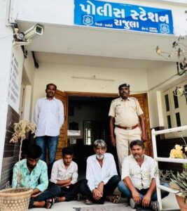 અમરેલી જિલ્લા પોલીસ અધિક્ષક શ્રી હિંમકર સિંહ સાહેબ તેમજ નાયબ પોલીસ અધિક્ષક શ્રી કે. જે. ચૌધરી સાહેબ નાઓએ અમરેલી જિલલામાં જૂગારની બદીને નેસ્ત નાબુદ કરવા સારૂ ખાસ સુચના અને માર્ગદર્શન આપેલ હોય જે અન્વયે રાજુલા પો.સ્ટે.ના પો.ઇન્સ.શ્રી ડી.વી.પ્રસાદ સાહેબની સુચના અને માર્ગદર્શન નીચે રાજુલા પો.સ્ટે. ના સર્વેલન્સ સ્કોડના અના.હેડ કોન્સ. બી.એમ.વાળા તથા ટાઉન બીટના એ.એસ.આઇ. ડી.ડી. મકવાણા વિગેરે પોલીસ સ્ટાફને મળેલ બાતમી આધારે રાજુલા બીડી કામદાર વિસ્તારમાં આવેલ બાપા સીતારામના ઓટા પાસે જાહેરમાં ટ્યુબલાઇટના અંજવાળે જૂગાર રમતા કુલ-૦૪ ઇસમોને રોકડા રૂપિયા-૧૨,૫૦૦/- ના મુદ્દામાલ સાથે પકડી, સદર આરોપીઓ વિરૂધ્ધ કાયદેસરની કાર્યવાહી કરવામાં આવેલ છે.ફોટોગ્રાફ પકડાયેલ આરોપીની વિગત:-(૧) અલાઉદીનભાઇ ઉમરભાઇ ઝાંખરા ઉ.વ.૫૫ ધંધો.નિવૃત રહે.રાજુલા, કુંભાર વાડા શેરી નં-૬, અંબાજી માતાના મંદિર પાસે.(૨) ભરતભાઇ જીણાભાઇ ડોળાસીયા ઉ.વ.૨૧ ધંધો.મજુરી રહે.રાજુલા, બીડી કામદાર, મસ્જીદ પાસે તા.રાજુલા જિ.અમરેલી.(૩) ફીરોઝશા દાદુશા દલ ઉ.વ.૪૦ ધંધો.ડ્રાઇવીંગ રહે.રાજુલા, બીડી કામદાર, બાપા સીતારામના ઓટા પાસે જિ.અમરેલી(૪) અફઝલ અમીરભાઇ જાડેજા ઉ.વ.૨૫ ધંધો.ડ્રાઇવીંગ રહે.રાજુલા બીડી કામદાર મસ્જીદ પાસે તા.રાજુલા જિ.અમરેલી આ કામગીરીમાં રાજુલા પો.સ્ટે.ના પો.ઇન્સ. શ્રી ડી.વી.પ્રસાદ તથા રાજુલા પો.સ્ટે.ના સર્વેલન્સ સ્કોડના UHC બી.એમ.વાળા તથા પો.કોન્સ. મીતેશભાઇ કનુભાઇ વાળા તથા પો.કોન્સ સંજયભાઇ કનુભાઇ ઘાંઘળ તથા પો.કોન્સ રોહિતભાઇ કાળુભાઇ તથા ટાઉન બીટના ASI ડી.ડી.મકવાણા તથા પો.કોન્સ. ઘનશ્યામભાઇ હસમુખભાઇનાઓ જોડાયેલ હતા.