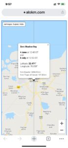 ખગોળીય ઘટનાની દ્રષ્ટિએ વર્ષમાં બે વખત સૂર્ય બરાબર માથા પર આવે ત્યારે તે જગ્યાએ અમુક ક્ષણો માટે પડછાયો અદશ્ય થઈ જાય છે. જેને ઝીરો શૅડો ડે તરીકે ઓળખવામાં આવે છે.