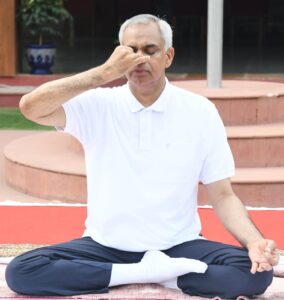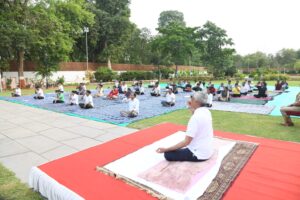 રાજભવન ખાતે આંતરરાષ્ટ્રીય યોગ દિને ગાંધીનગરના દિવ્ય જીવન સંઘના ઉપાધ્યક્ષ અને જાણીતા યોગ અને વેલનેસ કોચ શ્રી અશ્વિનભાઈ દવેના માર્ગદર્શન હેઠળ યોગાભ્યાસ કાર્યક્રમ યોજવામાં આવ્યો હતો. આ પ્રસંગે રાજ્યપાલશ્રીએ જણાવ્યું હતું કે મહર્ષિ પતંજલીએ યોગસૂત્રનું નિર્માણ કરીને સમસ્ત વિશ્વના કલ્યાણ માટે યોગ વિદ્યાને વિશ્વના ચરણે ધરી હતી જ્યારે ભારતના પ્રધાનમંત્રી શ્રી નરેન્દ્રભાઈ મોદીના સંનિષ્ઠ પ્રયાસને કારણે સંયુક્ત રાષ્ટ્રસંઘ દ્વારા ૨૧મી જૂનના દિવસને વિશ્વ યોગ દિન તરીકે ઘોષિત કરવામાં આવ્યો છે.