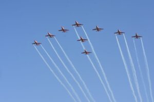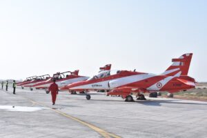 જામનગરમાં ભારતીય વાયુસેનાના તેજસ્વી સૂર્યકિરણ એરોબિક ટીમે અદ્દભૂત અને હેરતઅંગેજ કરતબો રજૂ કર્યા.