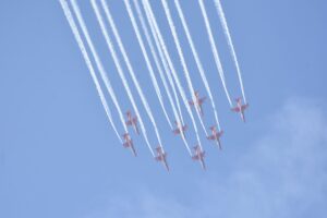 જીએનએ જામનગર: આઝાદી કા અમૃત મહોત્સવના ભાગરુપે ભારતીય વાયુ સેનાની સૂર્યકિરણ એરોબેટીક ટીમ (સ્કેટ) એ 90 મી વર્ષગાંઠની ઉજવણી માટે જામનગરના આકાશમાં વિવિધ કરતબો અને સ્ટન્ટ પ્રદર્શિત કર્યા હતા, ભારતીય સેનાની વિશ્વ વિખ્યાત સૂર્યકિરણ એરોબેટીક ટીમે આકાશને ભેદતાં અને આકર્ષક અને હેરતઅંગેઝ સ્ટન્ટ કરતાં જામનગરવાસીઓને રોમાંચિત અને ઠંડકની અનુભૂતિ કરાવી હતી,