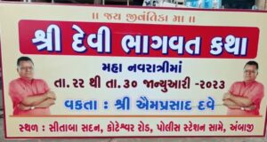અંબાજી ખાતે આજે 22 થી 30 જાન્યુઆરી સુધી મહા સુદ એકમ ના પવિત્ર દિવસે ગુપ્ત નવરાત્રી નો પ્રારંભ થવાથી ભક્તો દેવ દર્શન કરવા અને માતાજીના દર્શન કરવા જઈ રહ્યા છે ત્યારે શક્તિપીઠ અંબાજી ખાતે પણ અમારી ભક્તો મોટી સંખ્યામાં દર્શન કરવા આવ્યા છે તો ઘણા ભક્તો દ્વારા અંબાજી ખાતે દેવી ભાગવત કથામાં નવમ દિવસ સુધી હાજરી આપી માતાજીની આરાધના કરવામાં આવશે. અંબાજી ખાતે પ્રથમ વખત દેવી ભાગવત કથા મહા સુદ એકમ થી મહાસુદ નવમ સુધી યોજાવાજઈ રહી છે ત્યારે અંબાજી ખાતે શ્રી એમ પ્રસાદ દવે ના હસ્તે ભક્તો કથાનો સ્મરણ કરશે.કથા શરૂ થાય તે અગાઉ અંબાજી ખાતે પોથીયાત્રા કાઢવામાં આવી હતી જેમાં મોટી સંખ્યામાં બહેનો જોડાઈ હતી અને માતાજીના જય જય કાર સાથે કથાનો પણ પ્રારંભ થયો હતો