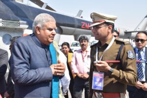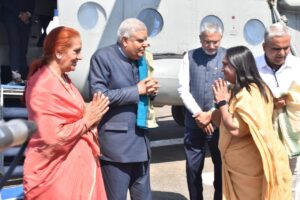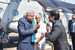 ભારતના માનનીય ઉપરાષ્ટ્રપતિશ્રી જગદીપ ધનખડ કચ્છના પ્રવાસે પધાર્યા છે ત્યારે ભુજ એરફોર્સ સ્ટેશન ખાતે આવ્યા બાદ તેઓ ખાસ હેલીકોપ્ટર મારફતે ધોરડો ખાતે પધાર્યા હતા. જ્યાં ધોરડો હેલિપેડ ખાતે માનનીય ઉપરાષ્ટ્રપતિ તેમજ લેડી વાઈસ પ્રેસિડેન્ટ સુશ્રી સુદેશ ધનખડનું રાજ્ય સરકાર વતી જિલ્લા વહિવટી તંત્ર દ્વારા કચ્છી શાલ ઓઢાડી પરંપરા મુજબ ભાવભર્યું સ્વાગત કરાયું હતું.