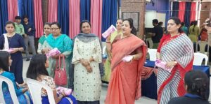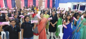 જામનગર ખાતે બ્રિલિયન્ટ સ્કૂલની વિદ્યાર્થીનીઓ સાથે વાર્તાલાપ કરી સેનેટરી પેડનું વિતરણ કરતા કેન્દ્રિયમંત્રી દર્શનાબેન.