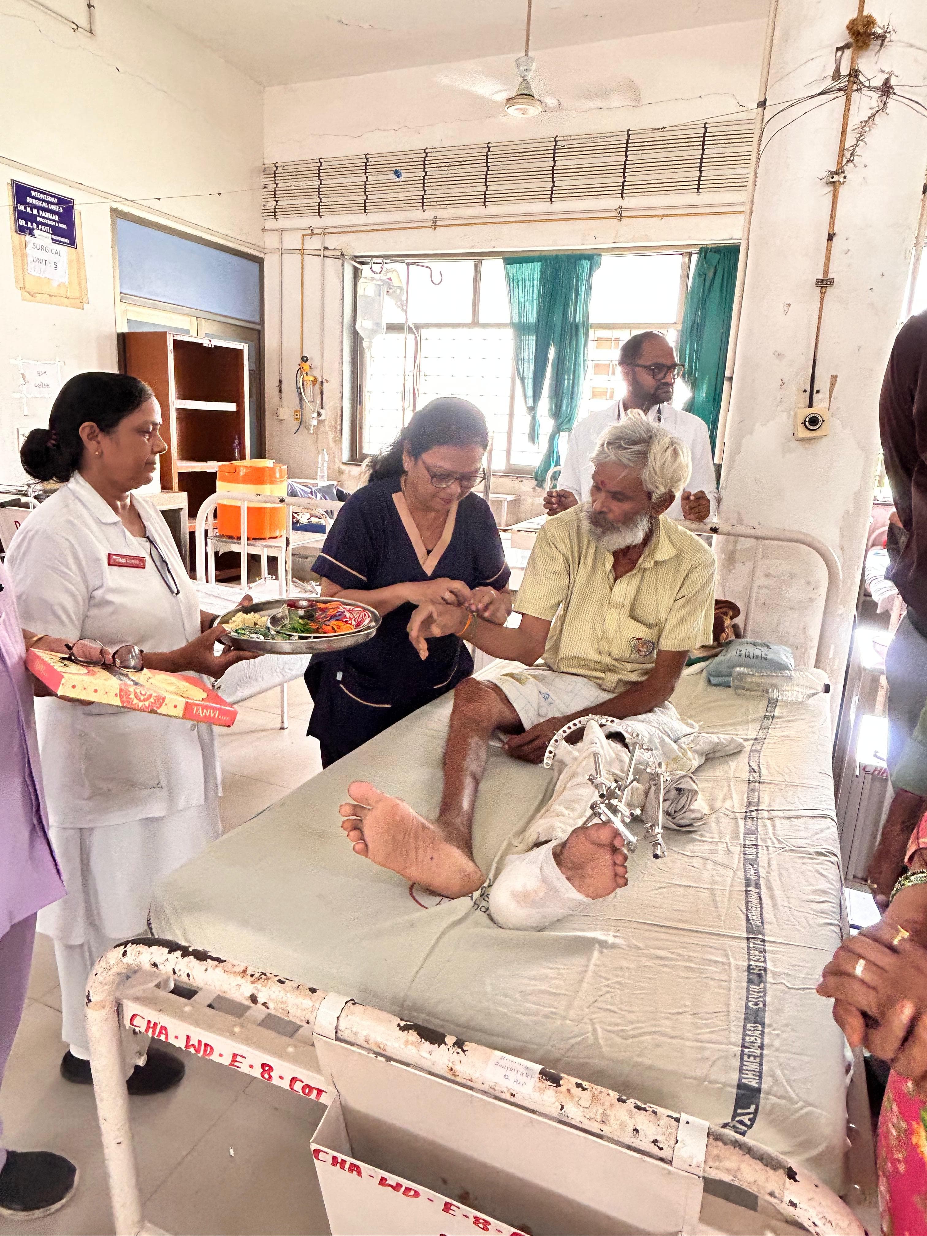 અમદાવાદ સિવિલ હોસ્પિટલના સુપ્રિટેન્ડેન્ટ રાકેશ જોષીએ જણાવ્યું હતું કે, રક્ષાબંધનના પર્વે જ્યાં બહેન ભાઈના હાથ પર રાખડી બાંધી તેની દીર્ઘ આયુષ્ય અને સુખાકારીની પ્રાર્થના કરે છે, ત્યાં અમદાવાદની સિવિલ હોસ્પિટલમાં એક અનોખું દ્રશ્ય જોવા મળ્યું હતું. હોસ્પિટલમાં સારવાર લઈ રહેલા બિનવારસી દર્દીઓ જેઓને તેમના પરિવારના સ્નેહનો સ્પર્શ નથી તેમને સિવિલ હોસ્પિટલ અમદાવાદના નર્સિંગ સ્ટાફ દ્વારા રાખડી બાંધવાનો એક અનોખો કાર્યક્રમ યોજવામાં આવ્યો હતો.