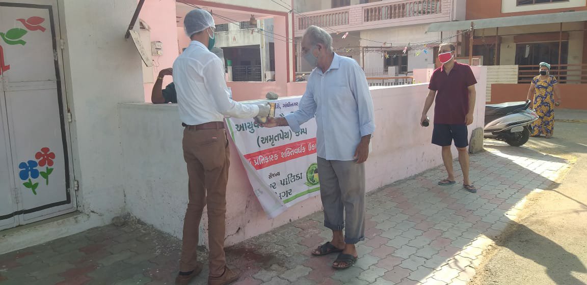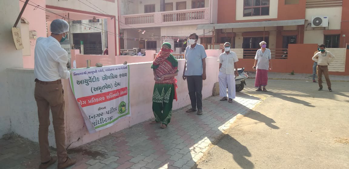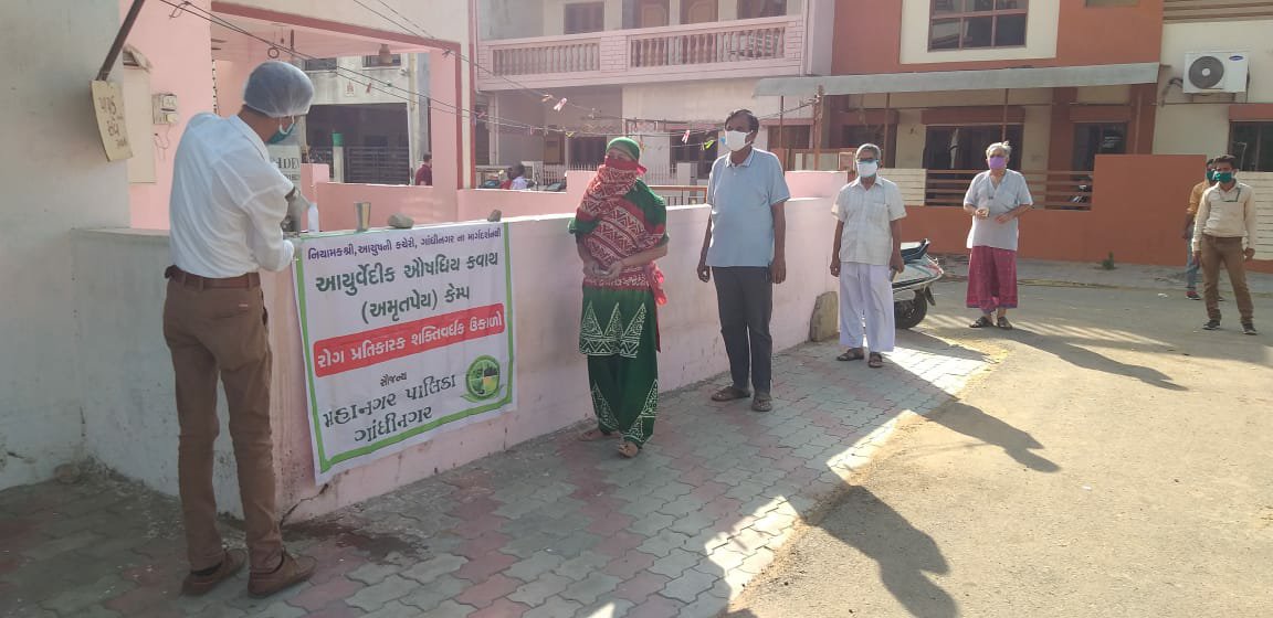 ગાંધીનગર: સોમવાર: નિયામકશ્રી આયુષની કચેરી અને ગાંધીનગર મહાનગરપાલિકાના સંયુક્રત ઉપક્રમે ગાંધીનગર મહાનગરપાલિકાના વિસ્તારના કન્ટેન્ટેમેન્ટ એરિયામાં નિયમિત સવારના રોગ પ્રતિકારક શક્તિ વધારે તેવા ઉકાળાનું વિતરણ કરવામાં આવી રહ્યું છે. છેલ્લા ચાર દિવસથી અંદાજે ૨૦ હજાર જેટલા લોકોને આ ઉકાળાનો લાભ લઇ રહ્યાં છે.