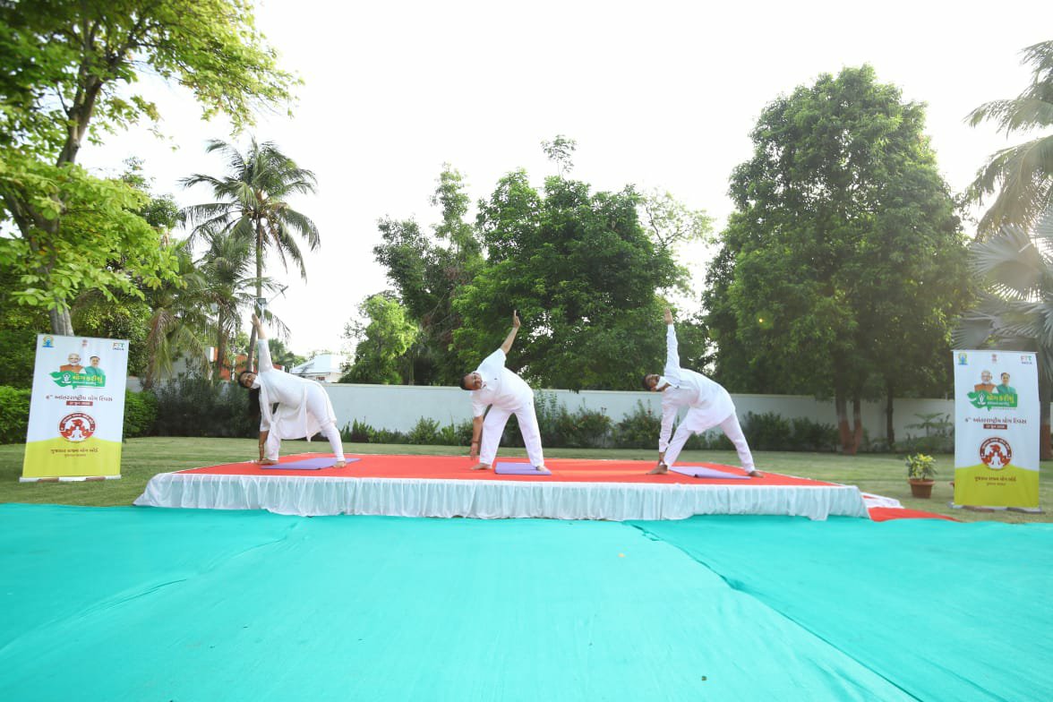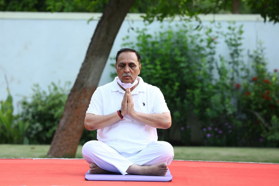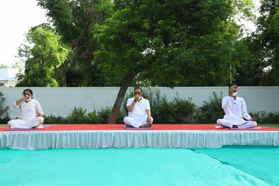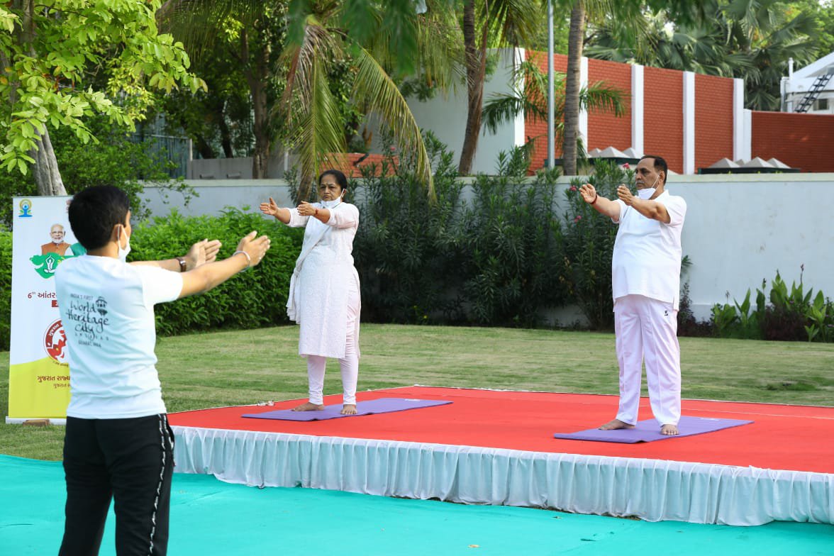 *તદનુસાર મુખ્યમંત્રીશ્રી વિજય ભાઈ રૂપાણી એ પણ ગાંધીનગરમાં મુખ્ય મંત્રી નિવાસ સ્થાન ના પ્રાંગણ માં શ્રીમતી અંજલિ બહેન રૂપાણી અને ગુજરાત રાજ્ય યોગ બોર્ડ ના અધ્યક્ષ શિષપાલજી સાથે સવારે યૌગિક ક્રિયાઓ અને આસનો કર્યા હતા*